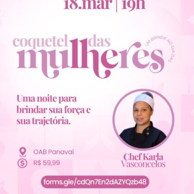 O evento contará com Coquetel exclusivo preparado pela Chef Karla Vasconcelos Música ambiente Espaço pensado para acolhimento e troca de experiências 📅 Data 18 de março🕖 Horário 19h📍 Local OAB Paranavaí 💗 Investimento R$ 59,99 Evento exclusivo para mulheres.Vagas limitadas. Garanta sua participação.Inscreva-se: forms.gle/cdQn7En2dAZYQzb48 💳 Pagamento via Pix.
