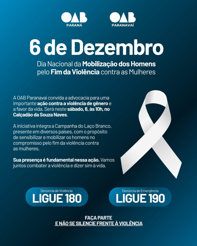 A OAB Paranavaí realiza, neste sábado (6), às 10h, no Calçadão da Souza Naves, uma mobilização da Campanha do Laço Branco, movimento internacional que engaja os homens no enfrentamento à violência contra as mulheres.